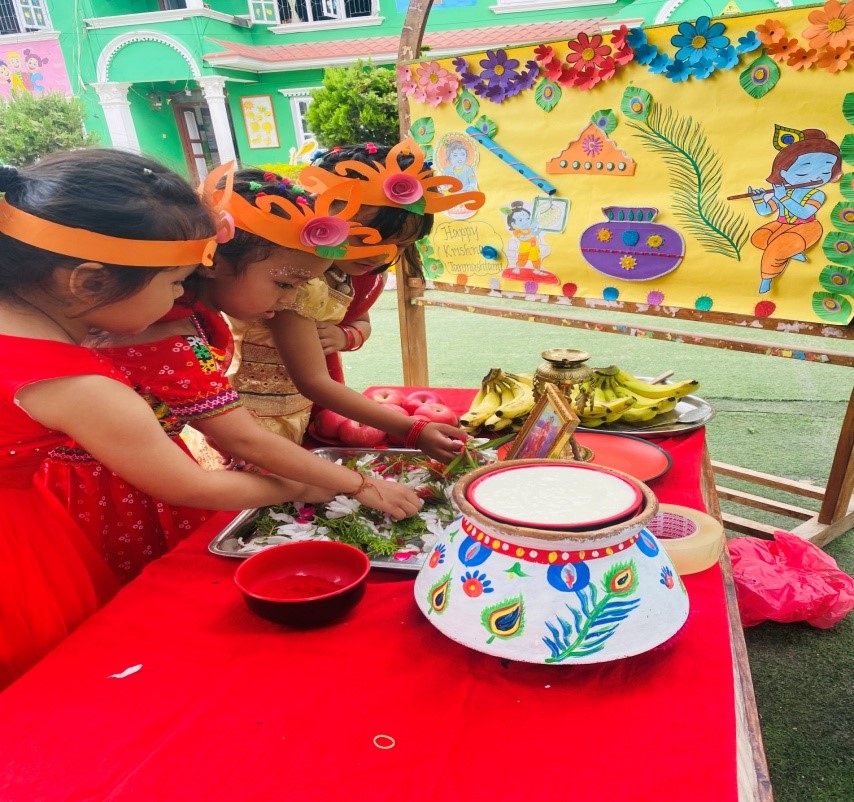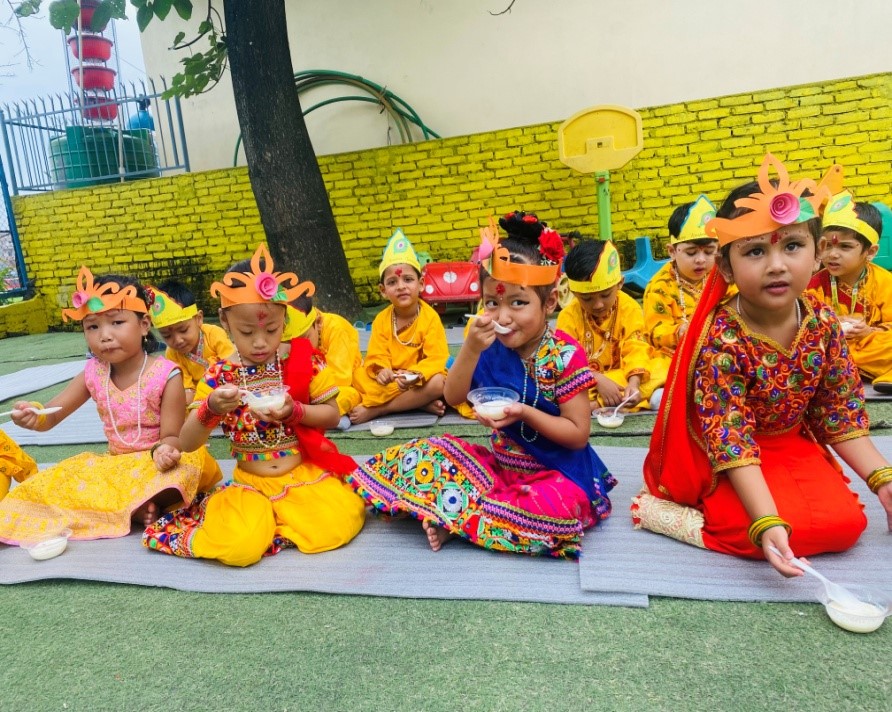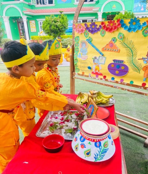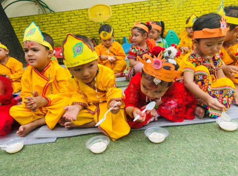 All the children, boys came with the Krishna’s dress and girls came with the Radha’s dress, and they all looked so beautiful. They worshiped the god Krishna and provided ‘Prasad’. All the children were curious, excited and enjoyed a lot It’s very difficult to make them clear on how and why Krishna Janmashtami is celebrated. But learning by doing concept is fruitful for the small children to understand easily. To make any festival alive celebration is the form to remind each and every events.